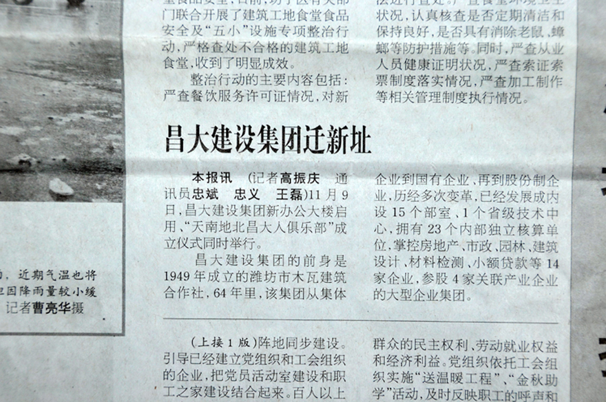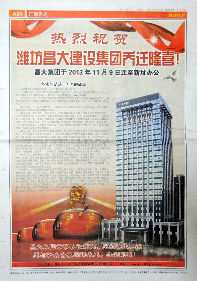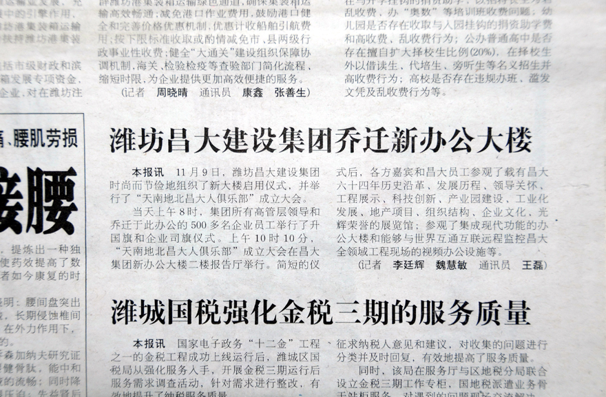 2013年11月09日,集團喬遷至高新區(qū)健康東街6999號,濰坊日報、濰坊晚報刊登集團喬遷慶典的報道。