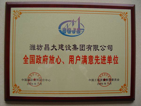 濰坊昌大建設(shè)集團被授予“全國政府放心、用戶滿意先進單位”榮譽稱號