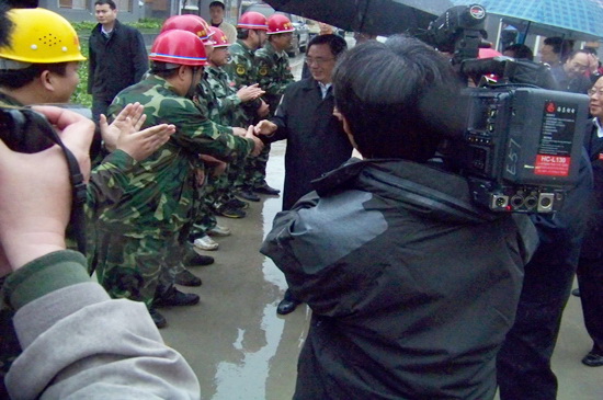 4月13日下午,春雨綿綿,中共中央政治局常委、中央紀(jì)律檢查委員會(huì)書記賀國強(qiáng)在有關(guān)人員陪同下,冒雨視察了北川新縣城援建工作。在集團(tuán)公司援建的溫泉一期安居房工程現(xiàn)場(chǎng),賀國強(qiáng)走進(jìn)住宅樓實(shí)地察看已經(jīng)建好的新居,非常高興,對(duì)山東省濰坊市援建的安居房工程給予很高的評(píng)價(jià),贊揚(yáng)山東省濰坊市的援建隊(duì)伍是一支能打硬仗的施工隊(duì)伍,他感謝在援建工作中作出辛苦努力的所有援建人員,并預(yù)祝圓滿完成援建任務(wù)。