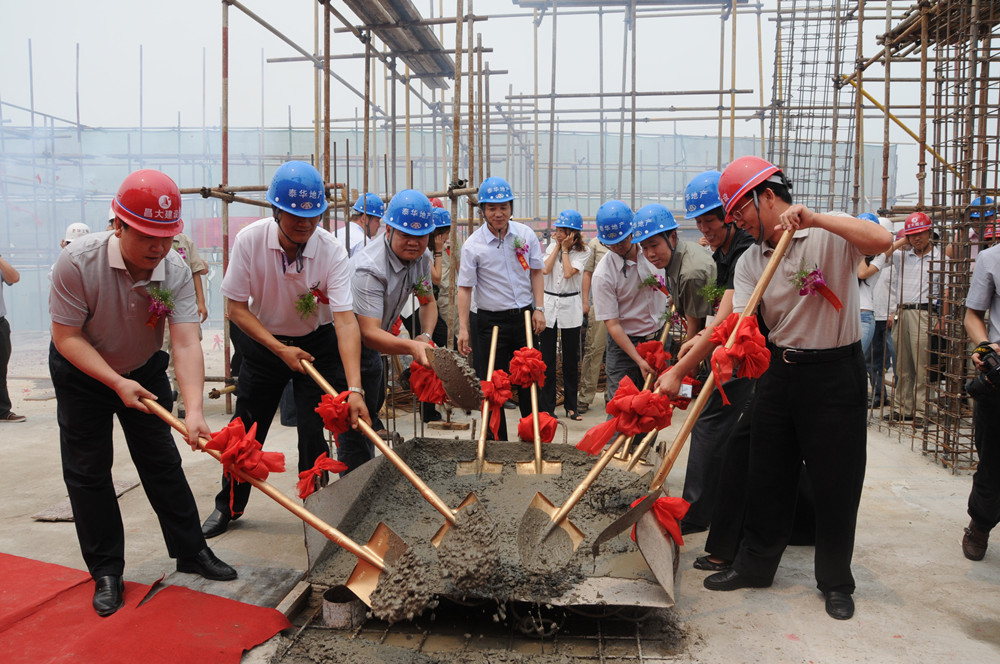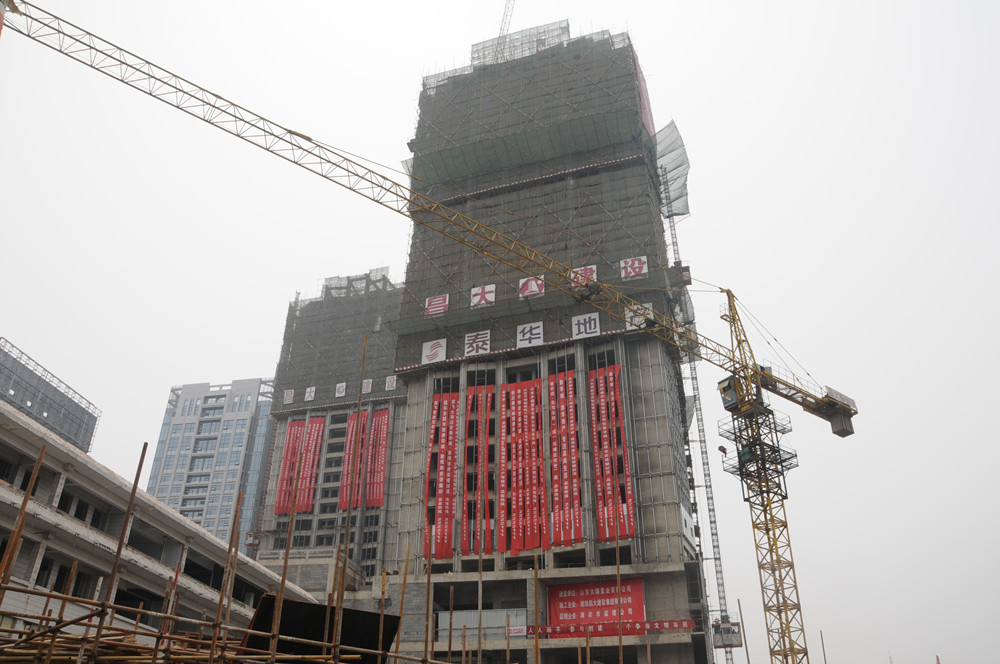 泰華城•榮觀華府工程是濰坊市唯一的商業(yè)CBD項目,工程位于美麗的白浪河畔。本期項目總建筑面積216673平方米,工程基礎(chǔ)采用CFG復(fù)合地基,2m厚的筏板基礎(chǔ),地下三層和地下二層為車庫,地下一層至四層為商業(yè),五層至二十九層為公寓。工程采用流線型設(shè)計,從空中看像游戈在白浪河中一條巨大的彩魚,從側(cè)面看像停泊在白浪河畔的一艘巨大的航母,1#東西塔樓像兩個巨大的風(fēng)帆。該工程自2010年4月15日筏板基礎(chǔ)圖紙出具以后正式開工建設(shè),第二分公司項目部組織人員搶工期,抓質(zhì)量,保形象,克服了施工現(xiàn)場狹小、工程結(jié)構(gòu)復(fù)雜、施工穿插組織難度大等各方面困難,歷時368天,以比原計劃工期提前26天的優(yōu)異成績封頂,同時實現(xiàn)優(yōu)質(zhì)、安全,贏得了建設(shè)單位和監(jiān)理單位的高度稱贊。該工程的提前順利封頂,為昌大和泰華兩個集團公司以后的戰(zhàn)略合作夯實了基礎(chǔ),埋設(shè)了基石,譜寫了輝章。