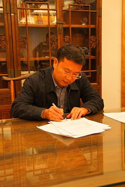 上圖為聯盟成立大會上各成員企業在商討相關事宜   上圖為昌大建設集團董事長徐鵬強在簽署成立文件   上圖為聯盟成員在青州市長韓幸福陪同下考察投資項目