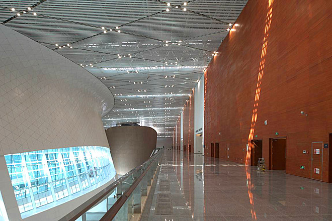裝飾分公司研發(fā)的玻鎂復合增強A級防火裝飾板,是一種新型防火墻面裝飾板,在會展中心工程中大面積應用,取得良好效果。