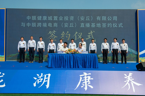 上午10:18,活動正式開始。李新閣同志代表安丘市委、市政府致辭,徐鵬強同志代表中頤健康城置業投資有限公司股東致辭。10:28,周波同志代表中頤龍湖康養小鎮與入駐小鎮的濰坊市中醫院安丘分院、安丘市老年大學市北區分校、中頤跨境電商(安丘)直播基地、濰坊干細胞再生醫學中心等四家合作單位的代表簽約。11:38,李新閣書記和徐鵬強董事長執起紅綢為山東中頤明天養老服務有限公司正式揭牌。11:48,隨著主席臺領導和嘉賓同時啟動燈光柱,中頤龍湖康養小鎮頤樂康養中心正式啟幕運行。