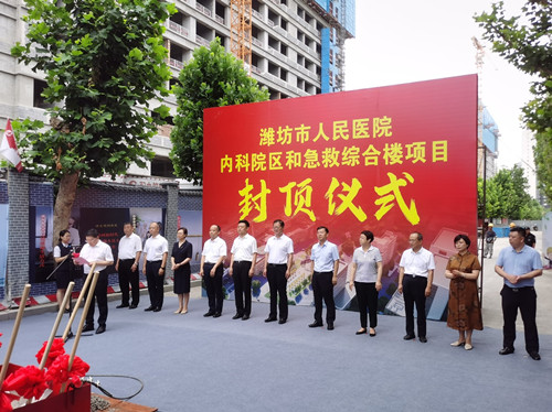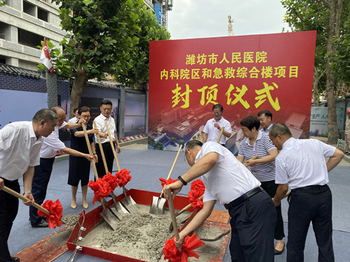 2023年7月25日上午10點18分,由集團四建公司、一建公司分別總承包施工的濰坊市人民醫院內科院區項目、急救綜合樓項目封頂儀式在內科院區項目現場隆重舉行。