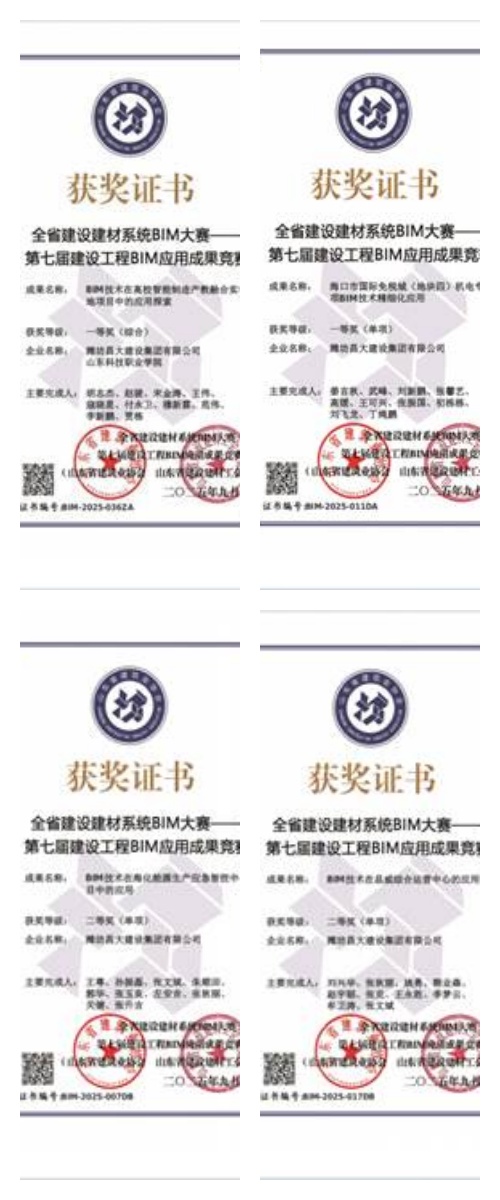 一則是,由山東省建筑業協會與山東省建設建材工會聯合舉辦的2025年第七屆建設工程BIM應用成果競賽公布了獲獎名單,集團公司組織申報的4項成果全部獲獎,其中一等獎2項、二等獎2項。