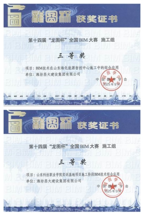 二則是,由中國圖學學會舉辦的第十四屆“龍圖杯”全國BIM大賽公布了獲獎結果。集團公司申報的《BIM技術在山東海化能源智控中心施工中的綜合應用》、《山東科技職業學院實訓基地項目施工階段BIM技術綜合應用》均獲三等獎。實現歷史新突破。